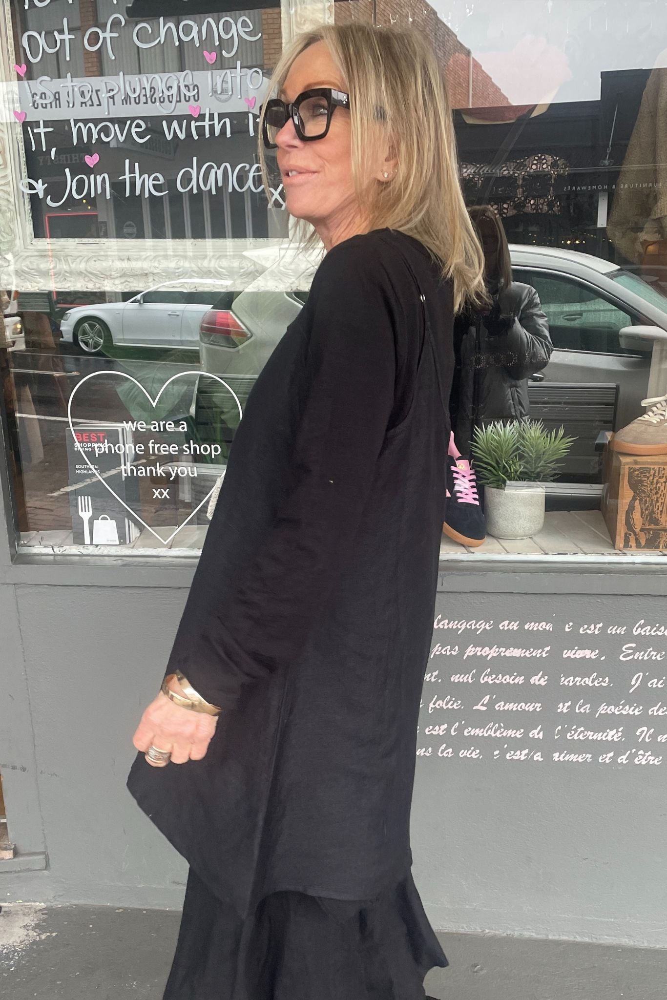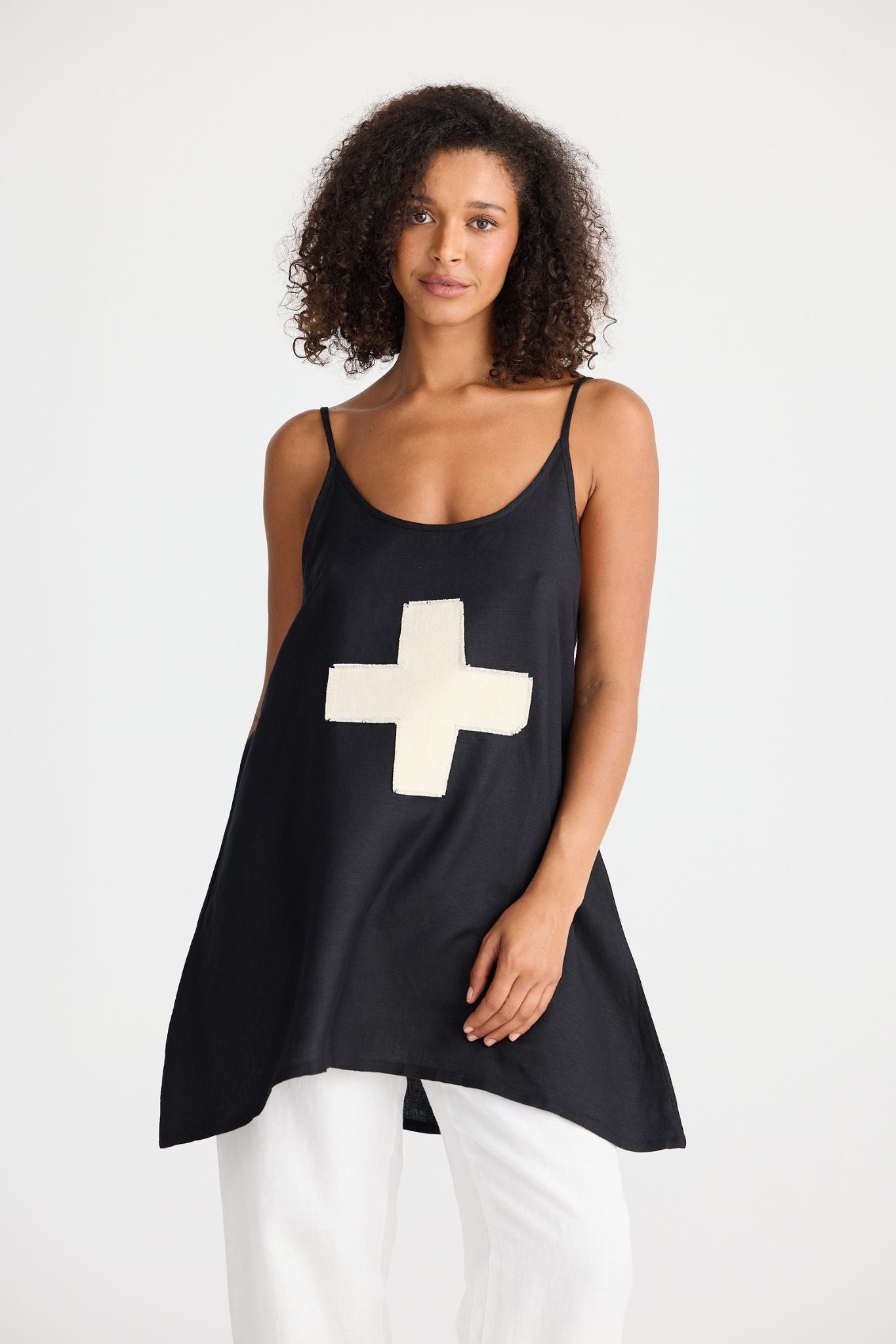 DESCRIPTION - the shakti singlet in black with white features a scoop neckline and a relaxed fit for comfortable wear. It includes adjustable straps to customise the fit and is made from a soft-to-the-touch linen viscose blend. a canvas cross patch adds a unique detail to this versatile singlet designed to support your everyday style.