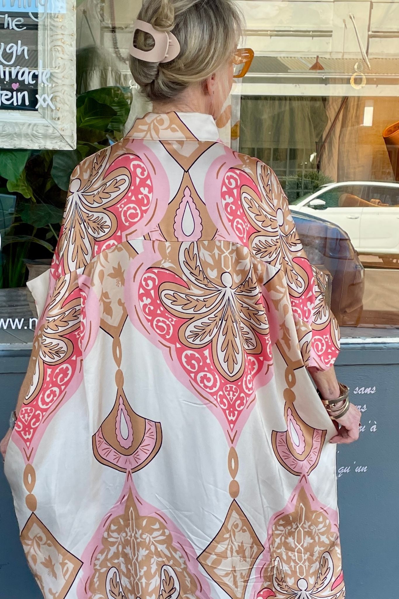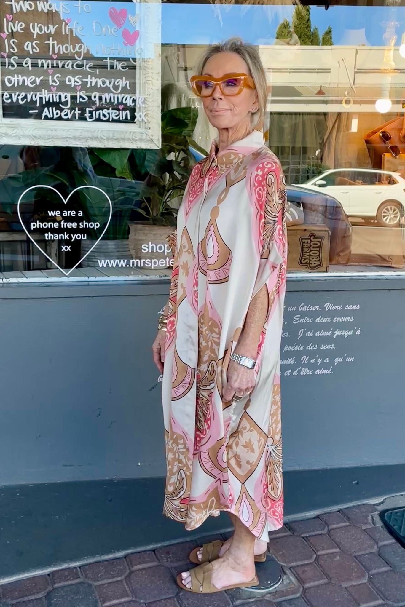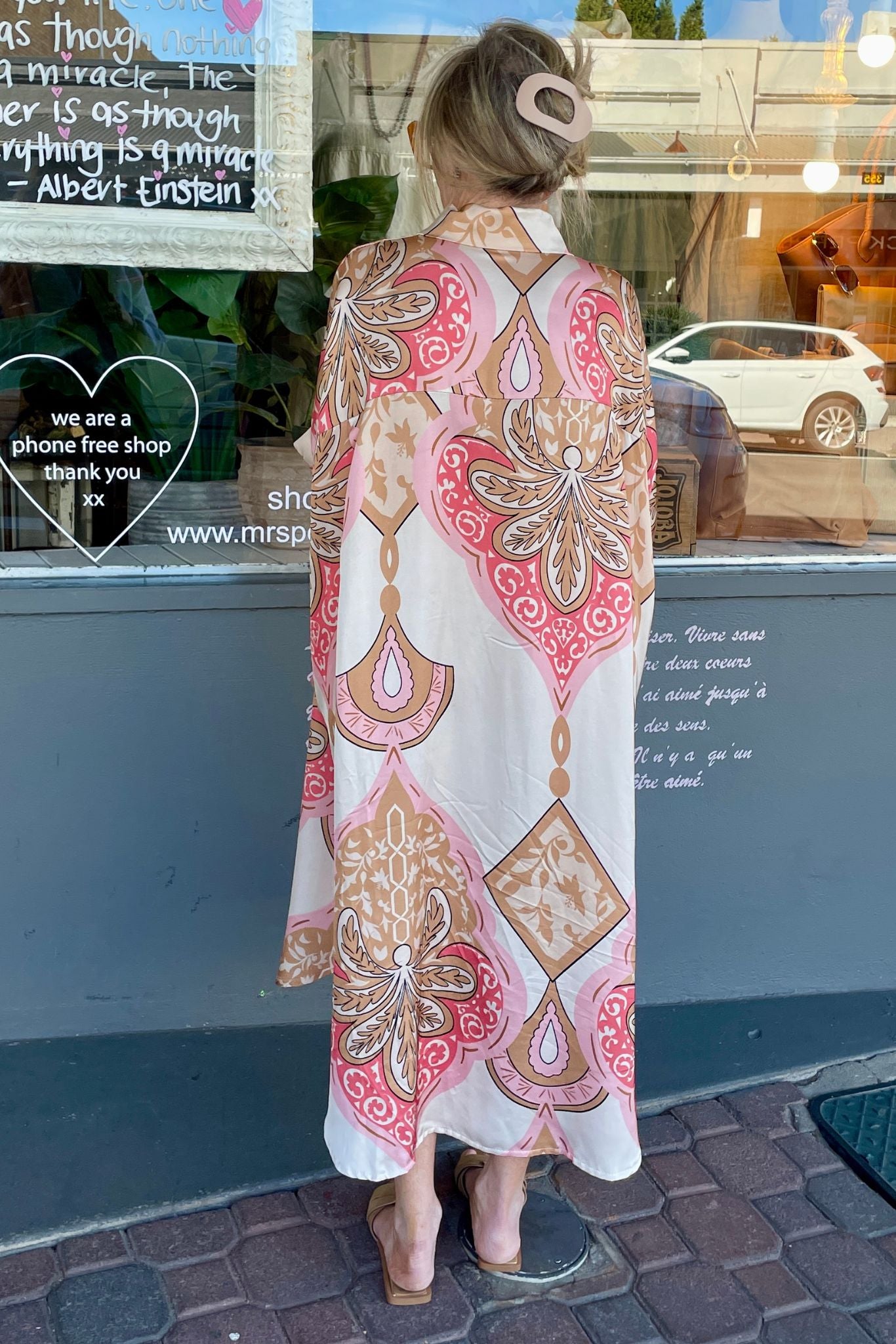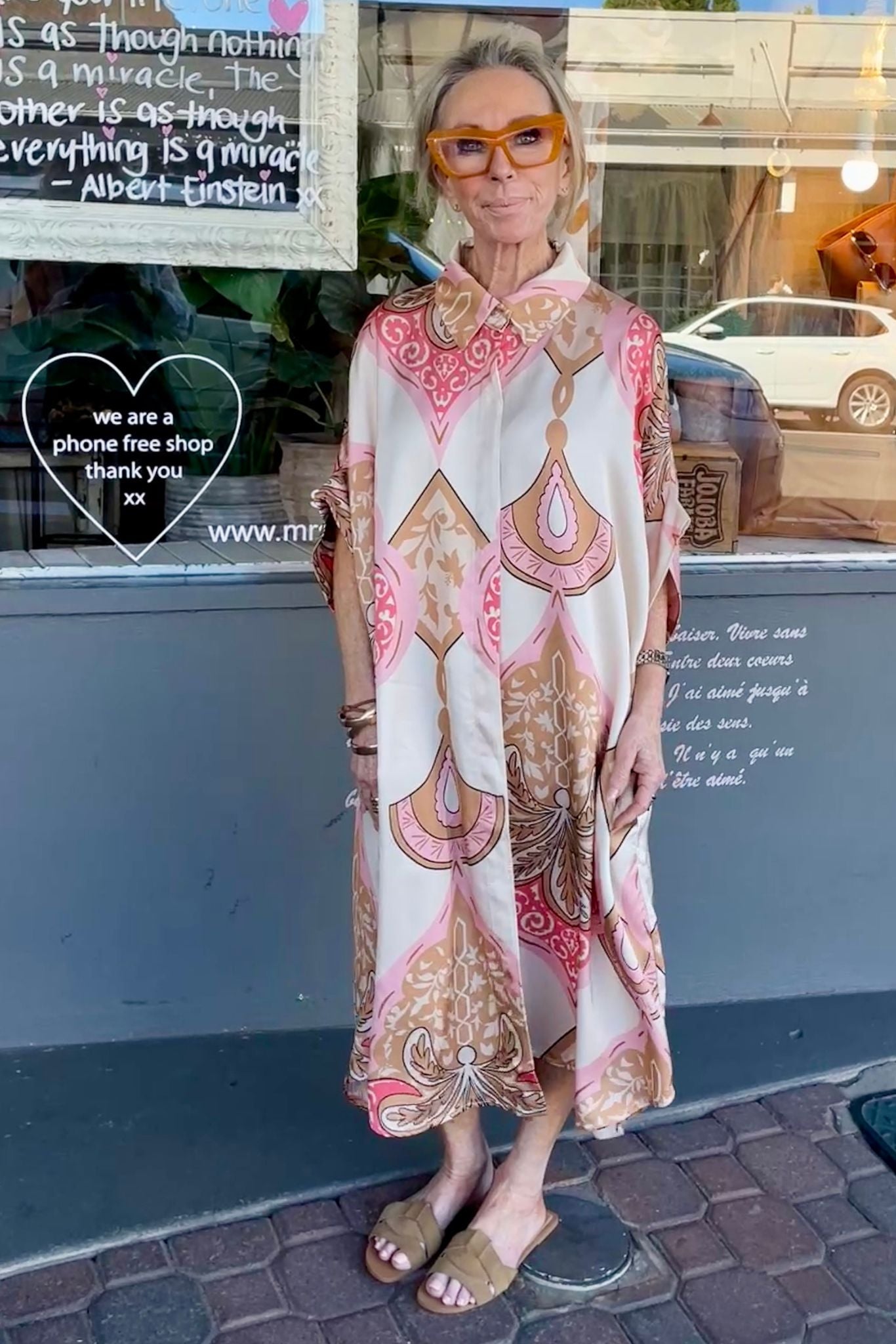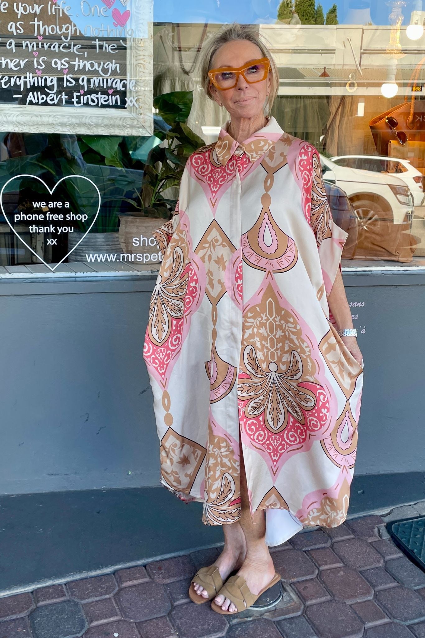 DESCRIPTION - the urban luxury shirt dress has a relaxed fit and soft drape for all-day comfort. designed with a collared neckline, a concealed button front and a beautiful abstract print detail featuring blush and gold tones. perfect for warm days or easy weekend style. the bold abstract print adds a touch of colour and effortless style. made in italy. pair with slides or sandals for a relaxed summer look or layer with denim jeans or white linen pants.