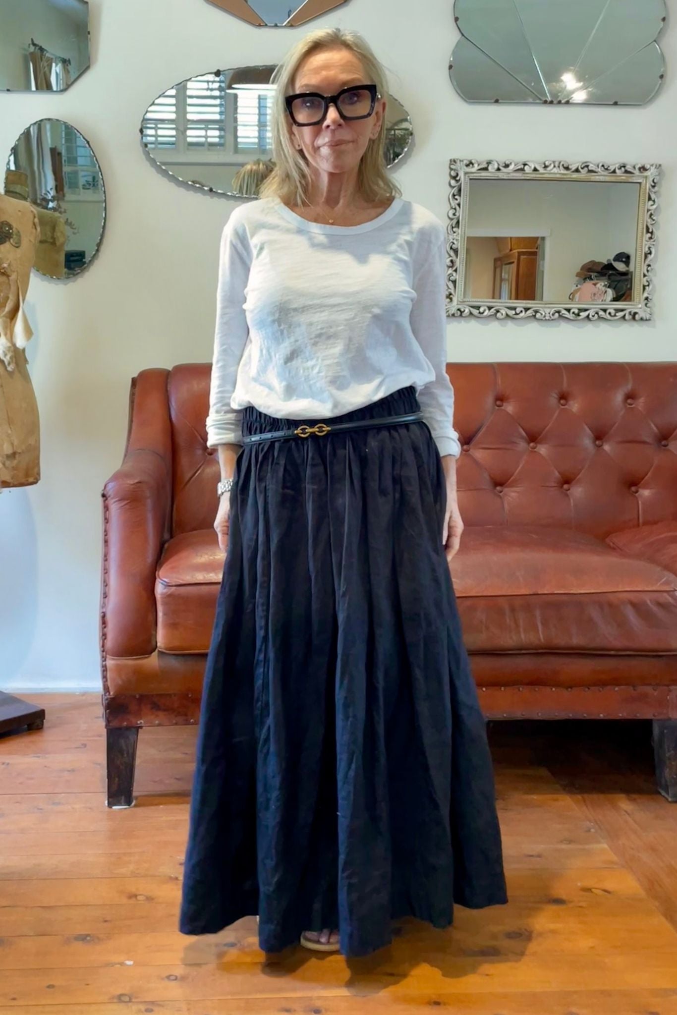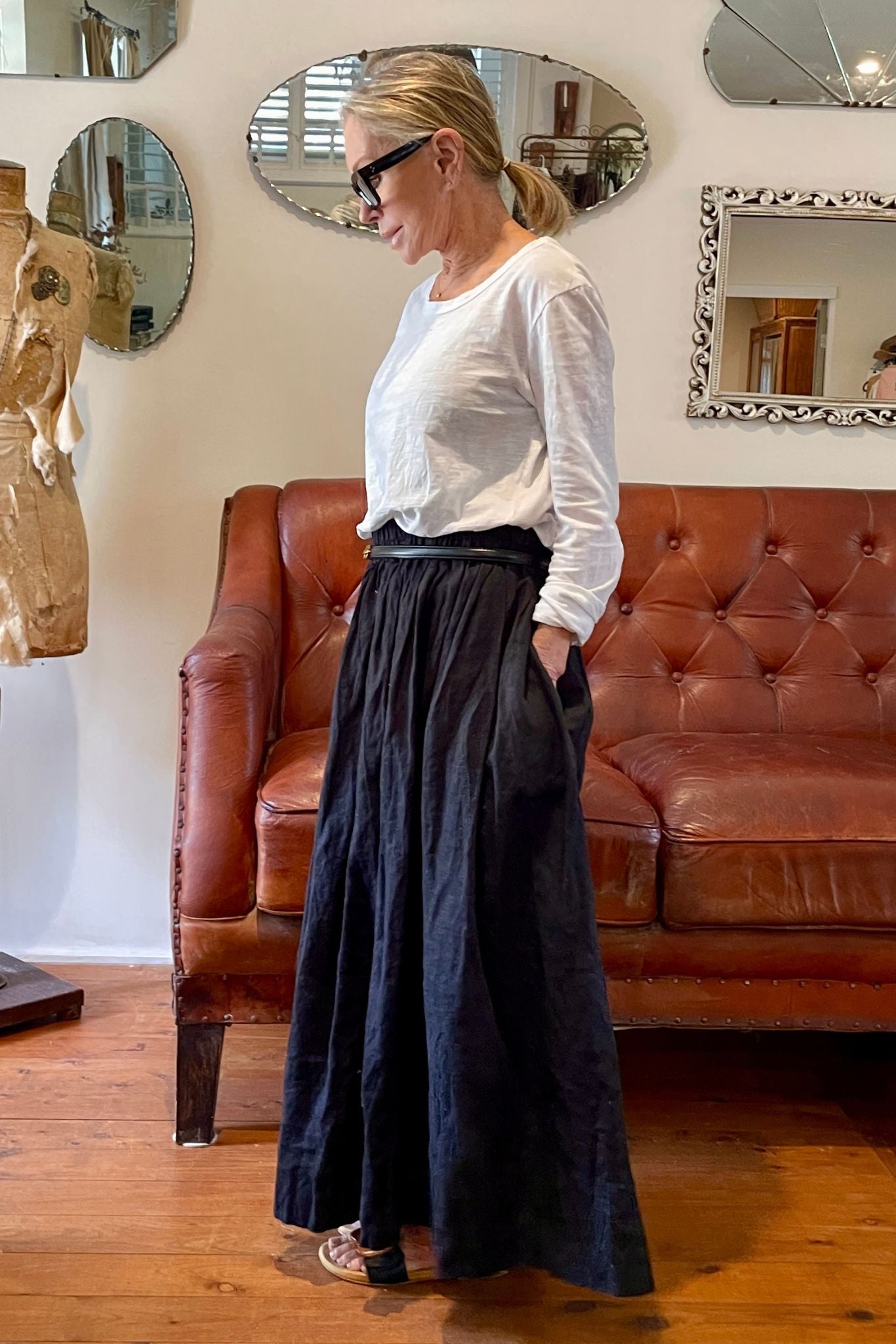 DESCRIPTION - a maxi skirt made from soft, medium weight 100% linen. the stunning rustic pleating gives this maxi skirt both comfort and edge. the 5cm wide elastic waist is secured to prevent rolling. wear on the waist or slightly lower for effortless style and versatility. this skirt is perfect for dressing up or down for any season with handy side pockets. looks great in the warmer months with slides as an everyday casual look. team it with an cotton tee, a great blazer and trainers or summer slides.